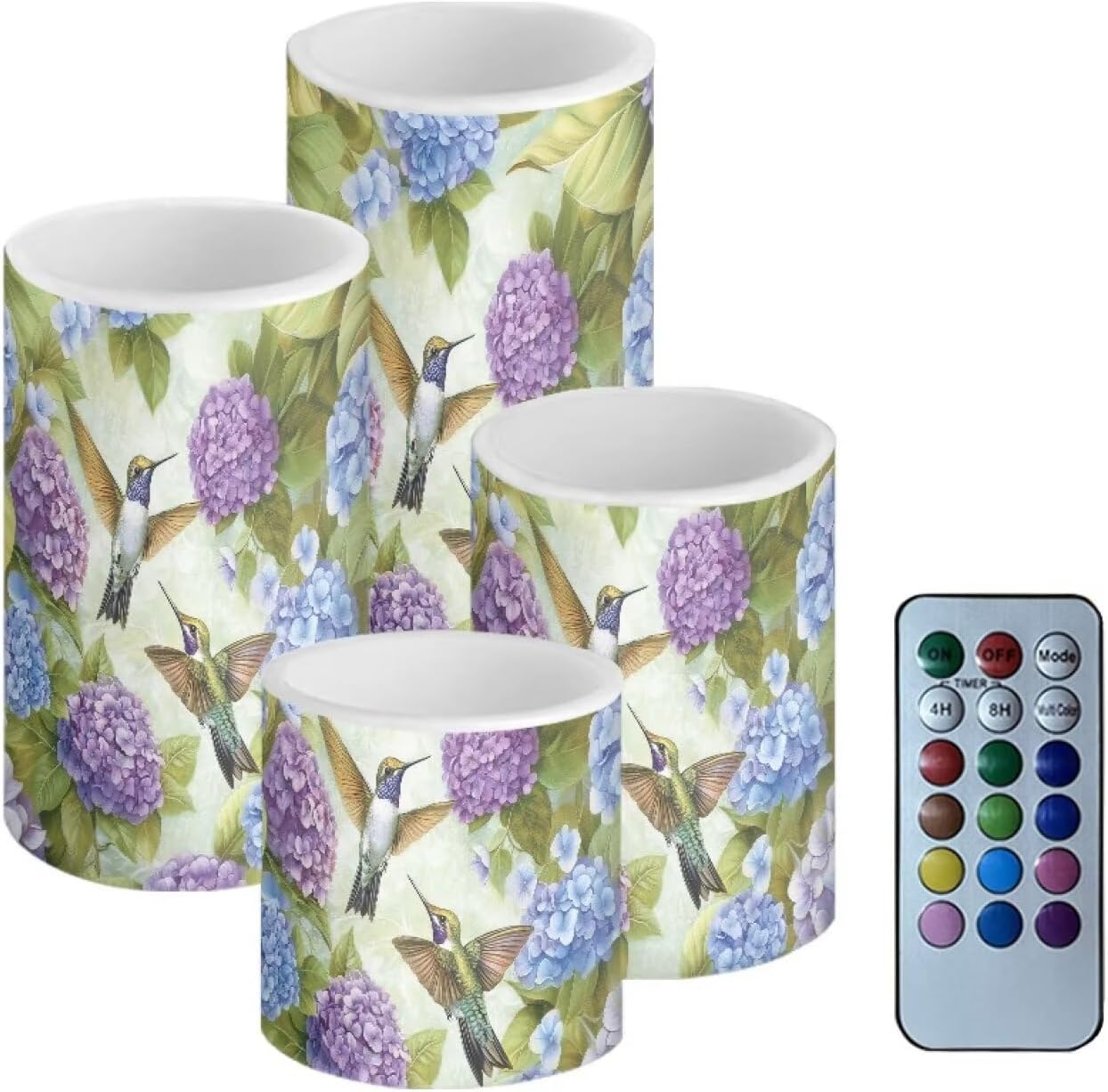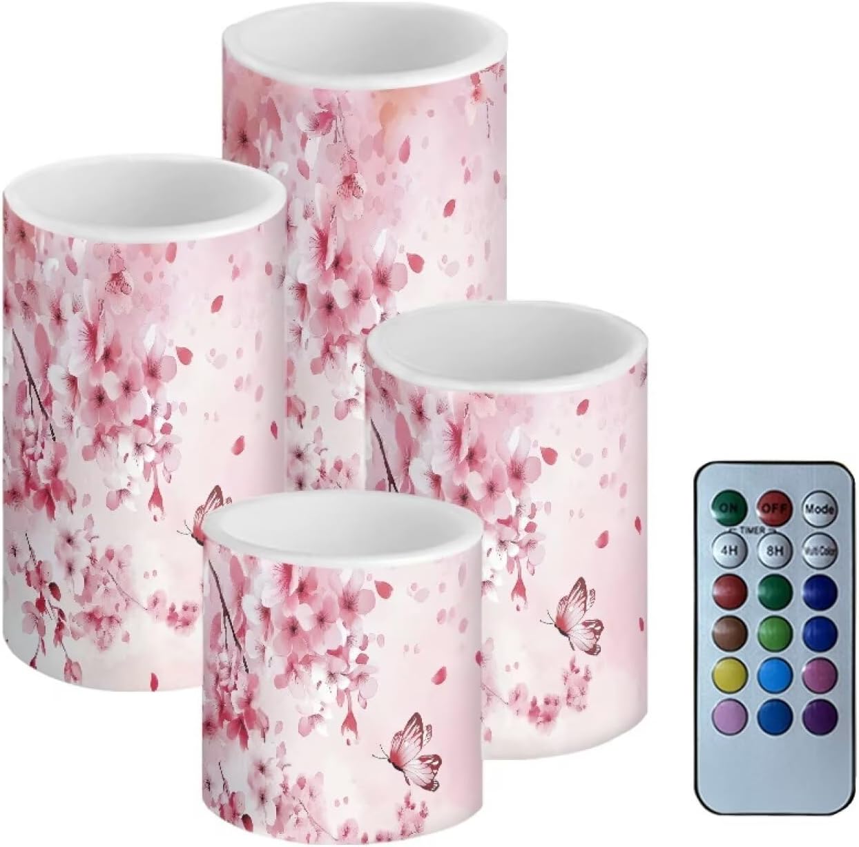 Candles Sets(not battery include) Material:Premium frosted plastic. Color: ivory color Candles comes in 4 different size: --Diameter 7.5cm/3inch Height 7.3cm/2.9inch --Diameter 7.5cm/3inch Height 9.7cm/3.8inch --Diameter 7.5cm/3inch Height 12cm/4.7inch --Diameter 7.5cm/3inch Height 14.5cm/5.7inch Features: --with remote control,12 colors for you choose,have 4-hour or 8-hour timing mode --warm yellow tealights with miniature flicker --turn on/ off manually. --battery operated by 3 x AAA batteries. (Batteries not Included) --these flameless candles set is long lasting,buy them once, enjoy them for years to come! --suit for any spaces,any weather,indoor or outdoor. --4 pieces battery candles,create a romantic atmosphere and sparks interest for wedding,parties,home,birthday,festival and other occasions. without the worry of fire hazard, wax melting or allergic scent, warmer and peaceful atmosphere will make you enjoy your event.You will love it. Using Tips: 1.When the battery is too weak for normal power supply, your flameless candle will dim light, please turn off the candle and replace the battery. 2.Do not mix old or new batteries. 3.when not in use for a long time, please remove the battery from the LED candle. Note: 1.Due to the different camera or lighting environment, please allow a little chromatic aberration. 2.Due to different measurement methods, please allow an error of 1-3mm. Thank you! 3.Thank you for your business! If you have any questions, please don't hesitate to contact us directly.