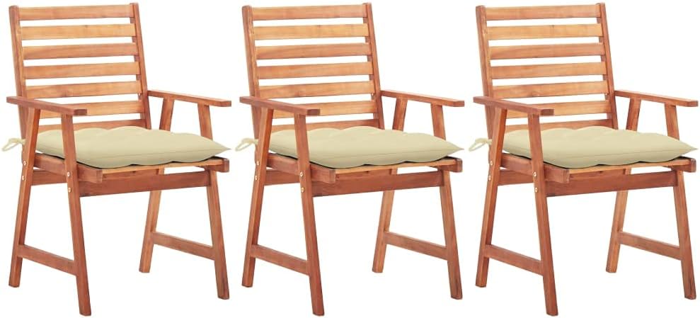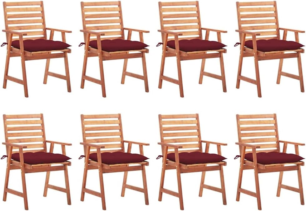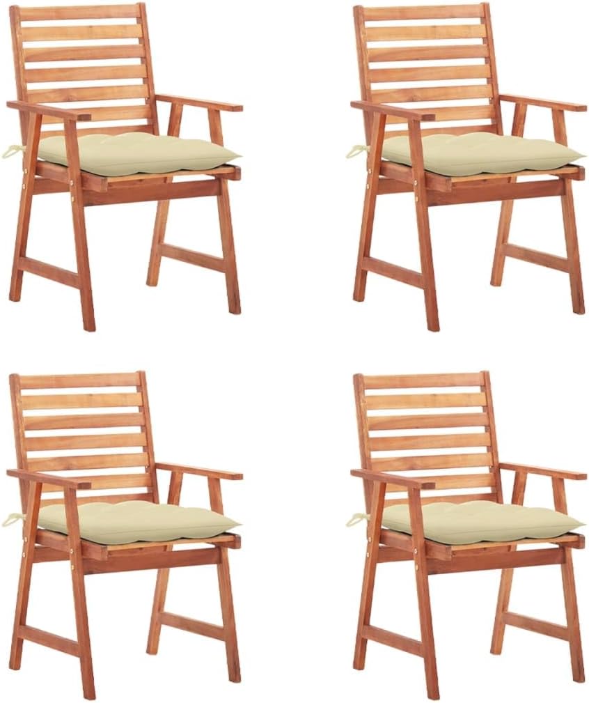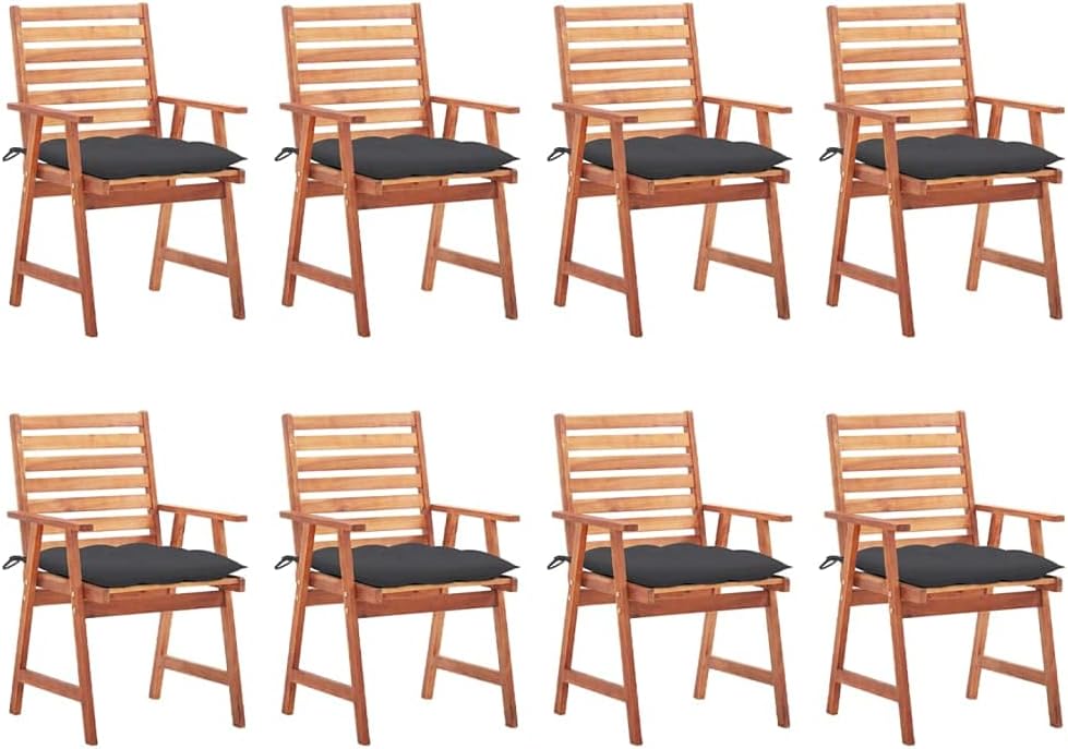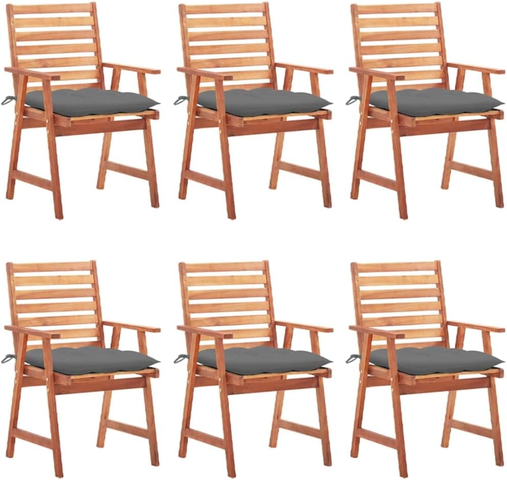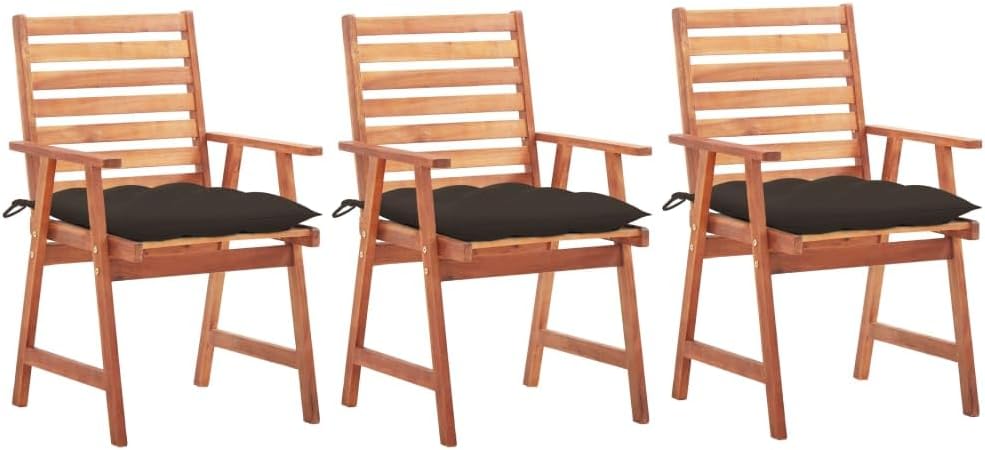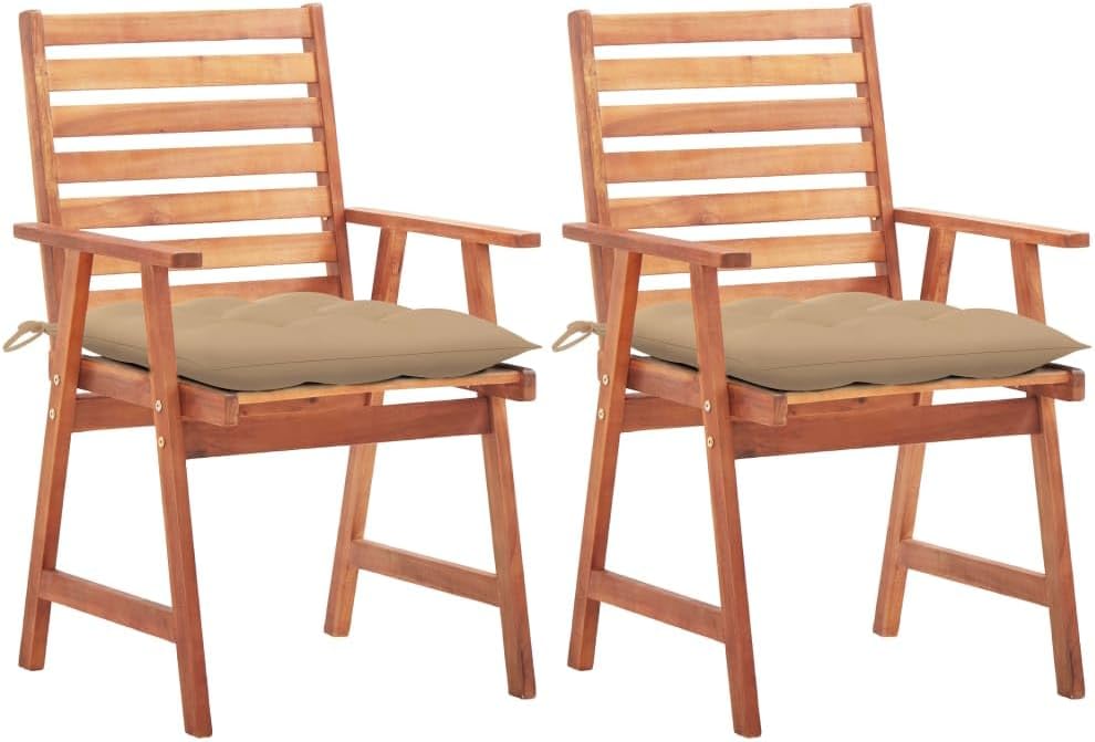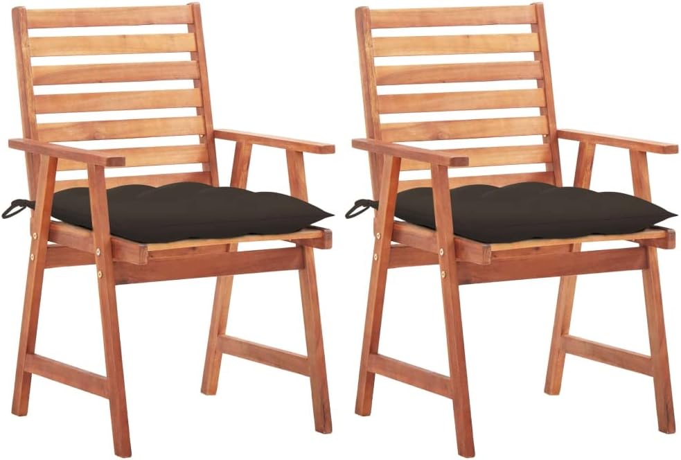 This contemporary wooden dining chair set with cushions will add a touch of natural style to your garden, terrace or patio. This wooden chair set will be a choice for al fresco dining.These garden chairs are made of solid acacia wood, a tropical hardwood, which is weather-resistant and durable for years of use. The oil finished surface is easy to clean with a damp cloth. The slatted design will bring a rustic charm. What's more, the included cushions provide extra comfort while seating. It is made of 100% polyester that has been treated to make it waterproof. Each cushion has two sets of ropes to fix it on the chair tightly.Cushion color: BlueMaterial of chair: Solid acacia woodMaterial of cushion: Fabric (100% polyester)Dimensions of chair: 22" x 24.4" x 36.2" (W x D x H)Dimensions of cushion: 19.7" x 19.7" x 2.8" (L x W x H)Seat width: 18.5"Seat height from the ground: 17.7"Armrest height from the ground: 24.8"Featuring slatted designWaterproof cushionEach cushion features 2 sets of ropesAssembly required: YesDelivery contains:2 x Chair with cushion