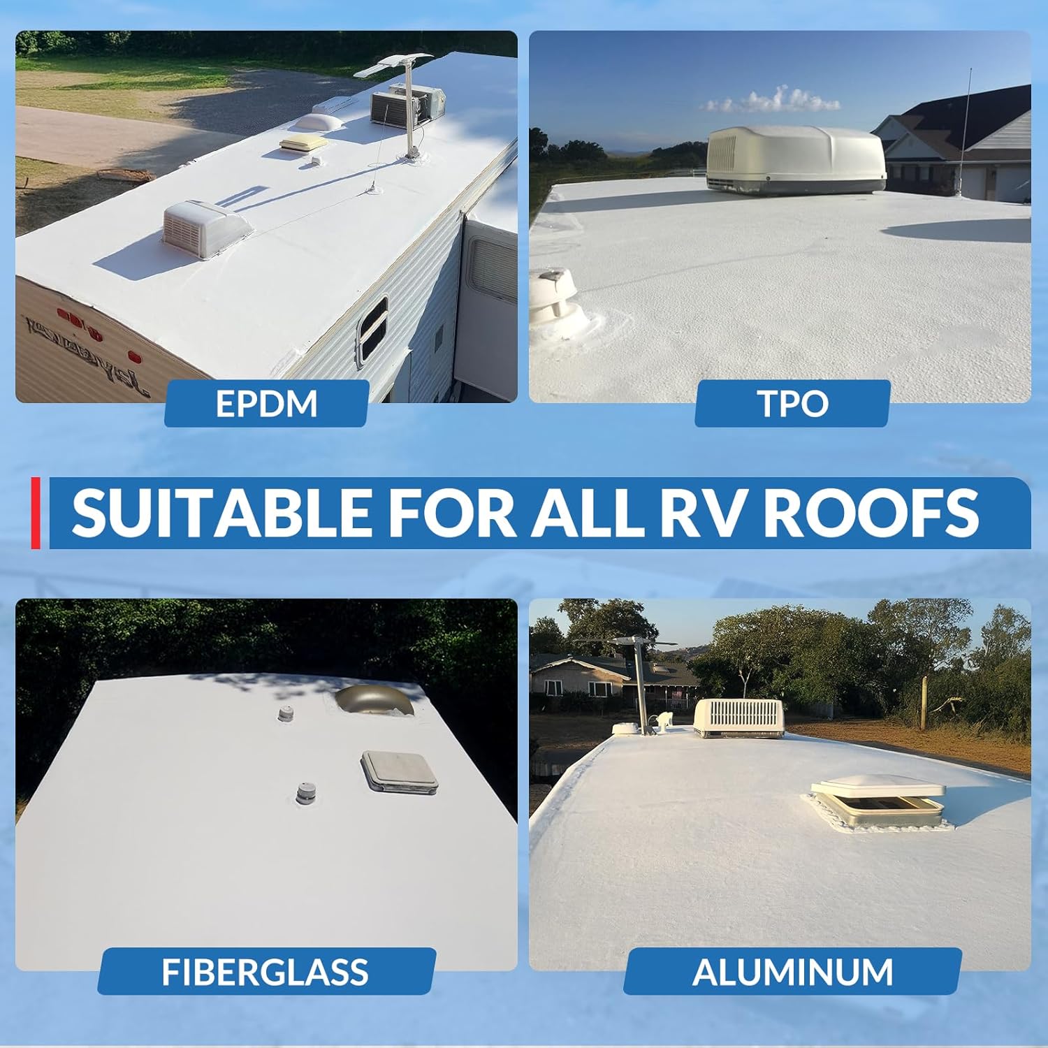 Touranize RV roof tape crafted with premium butyl material and upgrated Fluorocarbon film, offers unparalleled weatherproofing and UV resistance. With a remarkable flexibility range from -40°F to 140°F, this tape remains steadfast without the need for additional sealing. Simple and quick one-step repair, no additional adhesive required. Touranize RV Roof Coating provides professional waterproof sealing designed specifically for RV roofs. It forms a seamless, flexible membrane that prevents leaks and cracks, resists high temperatures and UV rays, and adapts to roof expansion and contraction. The white reflective coating helps reduce heat buildup, helps reduce roof temperatures by up to 27°F.