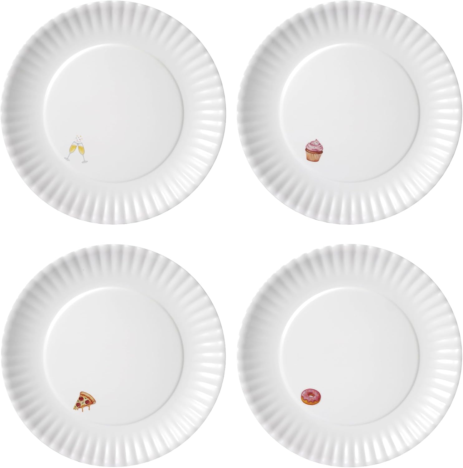 • Large and Stackable: Measuring 10.5 x 10.5 inches, this 4-piece plate set features festive party graphics like champagne, pizza, cupcakes, and donuts. When not in use, they nest neatly to save space and keep things organized